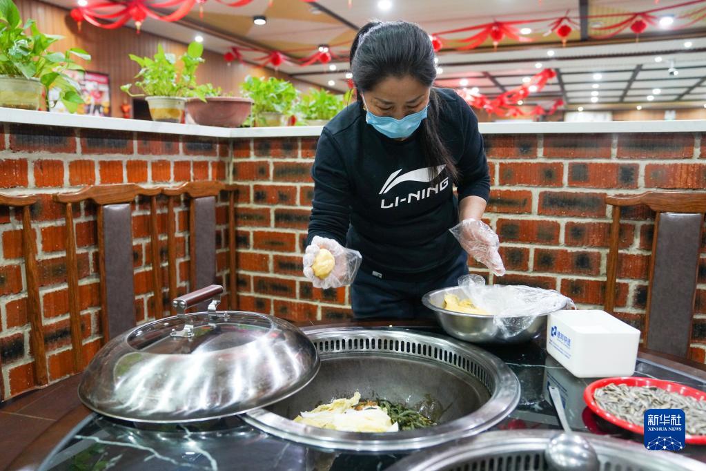 于淑芬為在自己經營的農家樂里為客人準備鐵鍋燉食材(11月21日攝)。在吉林市永吉縣北大湖鎮南溝村,53歲的村民于淑芬經營農家樂已有12年。目前,吉林市冰雪試驗區北大湖滑雪度假區旁的南溝村有餐廳、旅店100余家,民宿床位1700余張,帶動當地村民增收。