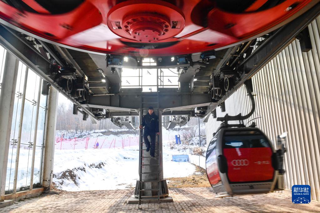 李連國巡檢索道運行情況(11月24日攝)。家住吉林市永吉縣口前鎮的李連國是一名農民。2021年冬天,他應聘成為吉林市冰雪試驗區北大湖滑雪度假區雪場運營部的一名索道工,負責滑雪場索道的運行及檢修保養工作,為自己找到了冬日里增收的“新營生”。