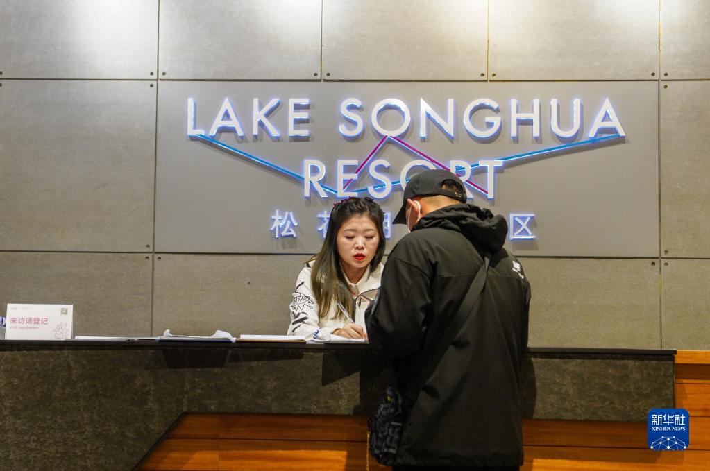 王爽(左)在吉林市萬科松花湖度假區前臺與客人交流(11月20日攝)。吉林市萬科松花湖度假區的前臺接待人員王爽家住在滑雪場山腳下的豐滿區段吉村。三年前,她辭去了在城里的工作,選擇來到距家里只有7公里的滑雪場工作?!氨┊a業前景廣闊,能把我們留在家鄉?!蓖跛f。
