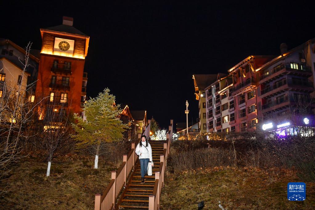 結束一天的工作,王爽前往班車點乘坐班車回家(11月20日攝)。吉林市萬科松花湖度假區的前臺接待人員王爽家住在滑雪場山腳下的豐滿區段吉村。三年前,她辭去了在城里的工作,選擇來到距家里只有7公里的滑雪場工作?!氨┊a業前景廣闊,能把我們留在家鄉?!蓖跛f。