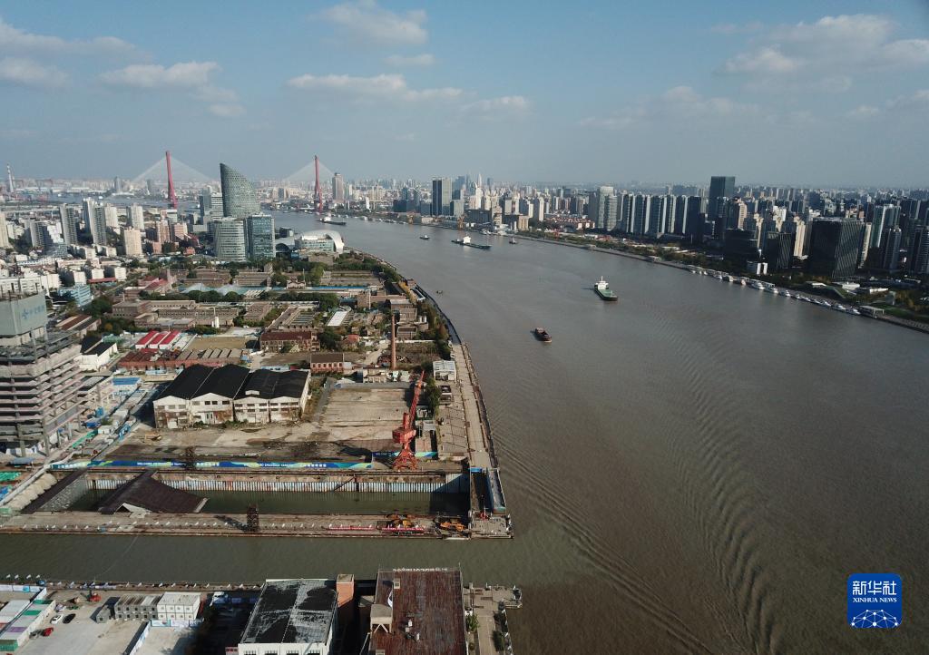 上海船廠舊址1號船塢已打開閘門,完成灌水,靜候長江口二號古船(無人機照片,11月24日攝)。