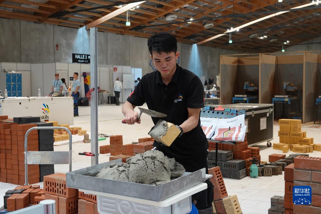 11月24日,來自中建五局高級技工學校的伍遠州在奧地利薩爾茨堡參加2022年世界技能大賽特別賽奧地利賽區砌筑項目比賽。