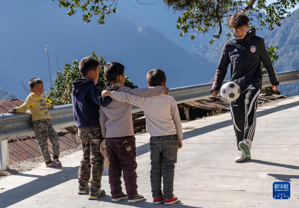 在西藏林芝市墨脫縣德興鄉巴登則村,旺前羅布向弟弟們展示自己的球技(2021年2月9日攝)。