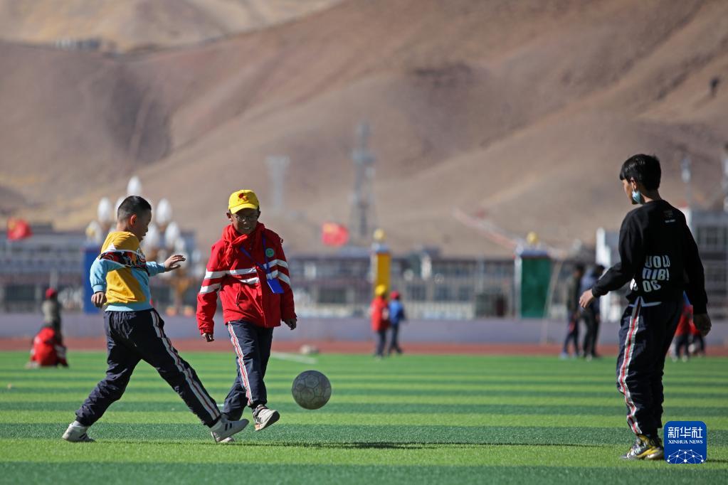 西藏阿里陜西實驗學校的孩子們在踢足球(4月11日攝)。