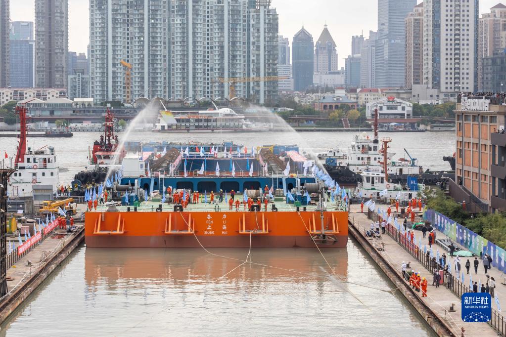 11月25日,“奮力”輪載著長江口二號古船進入上海船廠舊址1號船塢,現場噴水慶祝。