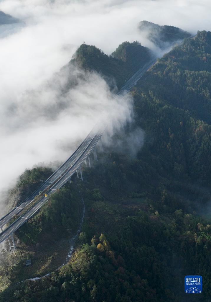 當日,湖北宣(恩)鶴(峰)高速公路在云霧中若隱若現,美如畫卷。