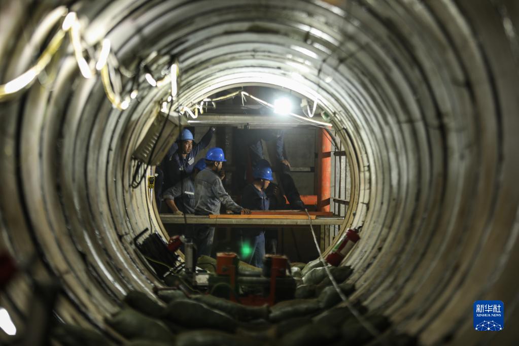 南方電網公司項目人員在粵澳聯網220千伏第三通道電纜管廊內進行施工作業(2019年5月13日攝)。
