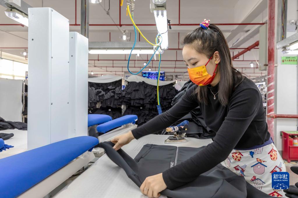 11月25日,員工在貴州省黔西市岔白工業園區一家服飾公司生產車間加工服裝。