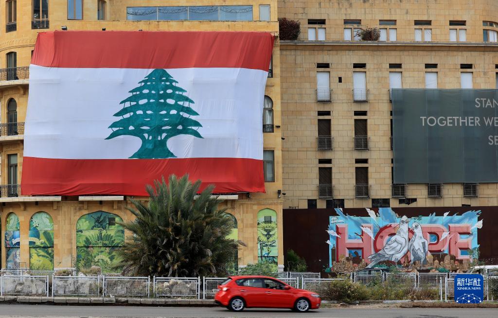 11月22日,一輛汽車駛過黎巴嫩首都貝魯特街頭懸掛的巨型國旗。