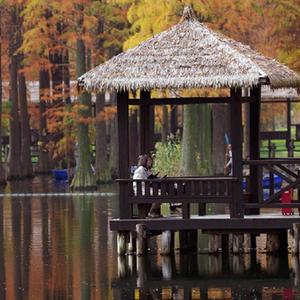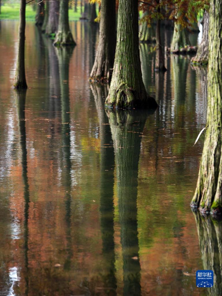 近日,上海青西郊野公園“水上森林”的水杉、池杉、落羽杉等枝頭盡染,風景如畫。