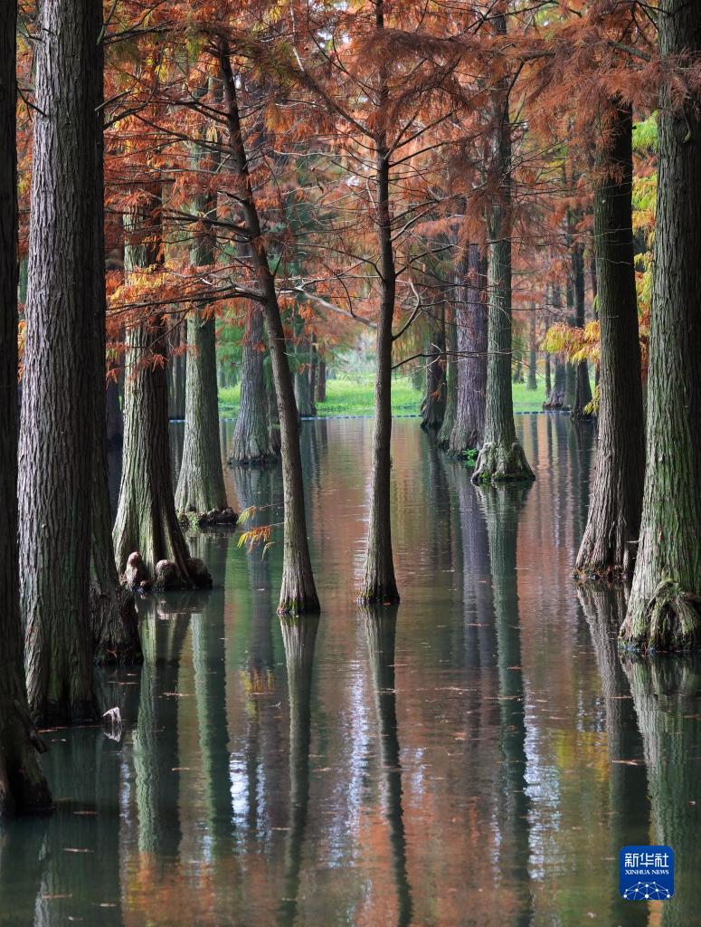 近日,上海青西郊野公園“水上森林”的水杉、池杉、落羽杉等枝頭盡染,風景如畫。
