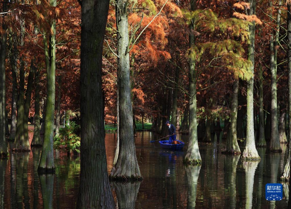 近日,上海青西郊野公園“水上森林”的水杉、池杉、落羽杉等枝頭盡染,風景如畫。