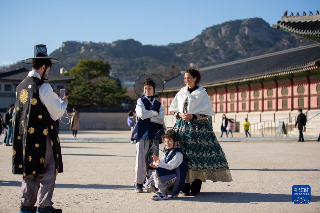 11月26日,人們在韓國首爾景福宮內游覽時拍照。