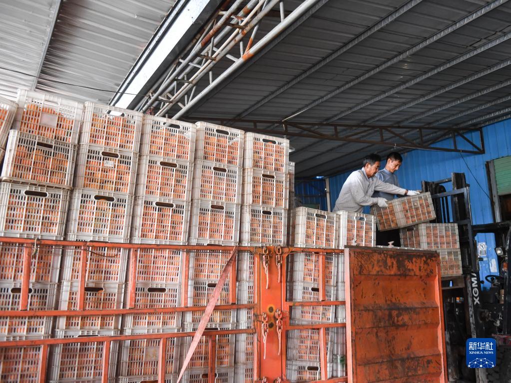 11月26日,在信豐縣安西鎮一家臍橙專業合作社,果農將臍橙裝車。