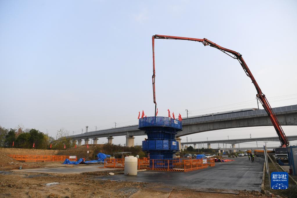11月26日,中鐵四局施工人員在新建滬寧合高鐵安徽段首根墩身澆筑現場作業。