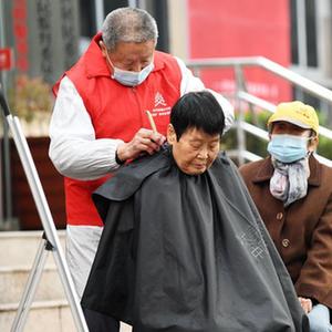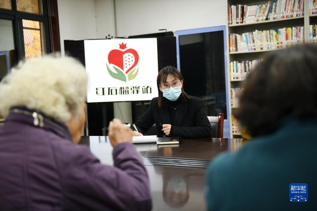 11月17日,西安市雁塔區電子城街道二〇五所社區黨支部書記于珍(中)在紅石榴驛站接待兩位社區居民,幫助解決她們的房屋供暖等問題。