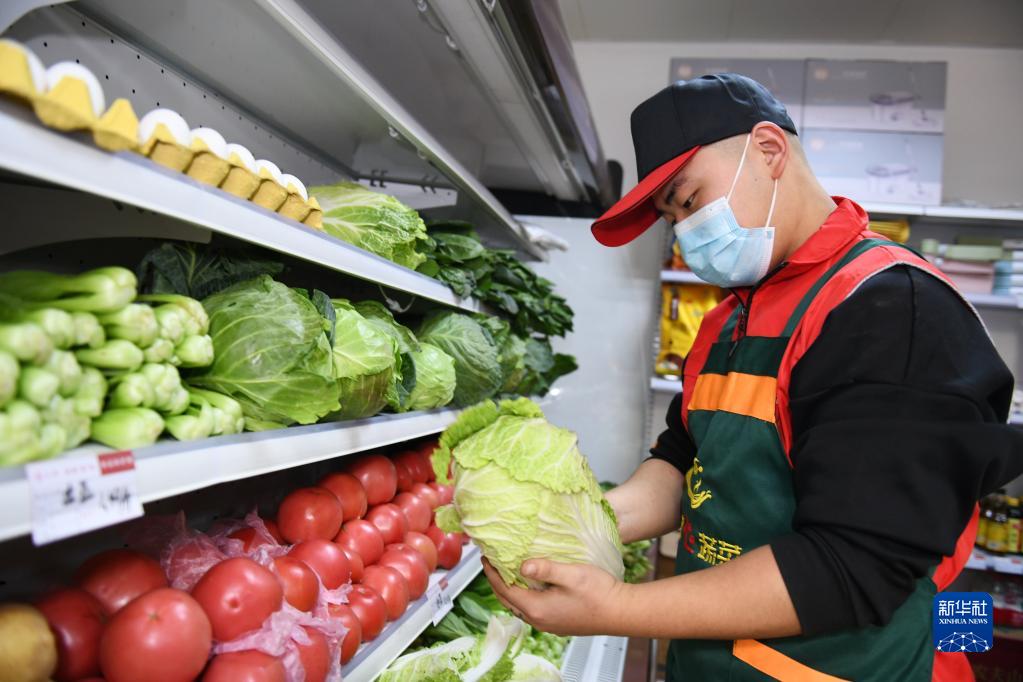 11月17日,在西安市雁塔區電子城街道二〇五所社區大安·能量“益”站,志愿者賀鑫在整理貨架上的蔬菜。