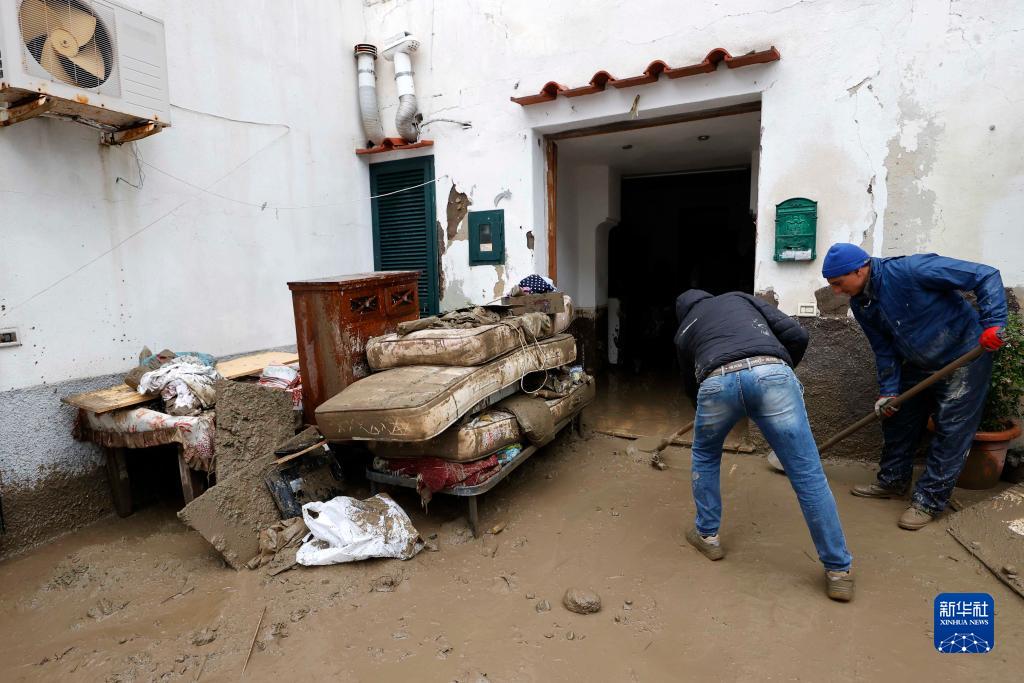 11月26日,人們在意大利伊斯基亞島清理受災的房屋。