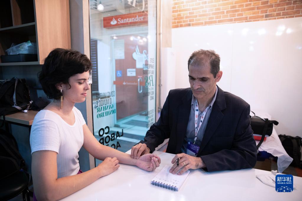 11月26日,在巴西圣保羅舉行的世界中醫藥大會上,一名中醫(右)為嘉賓把脈。