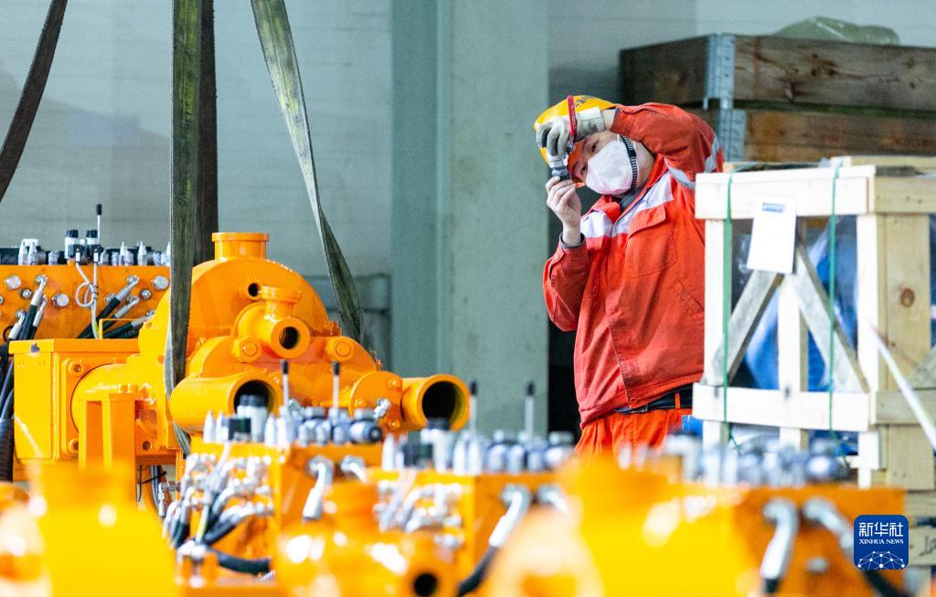 11月23日,工人在中鐵裝備集團車間內核對自制注漿泵液壓系統閥門型號。