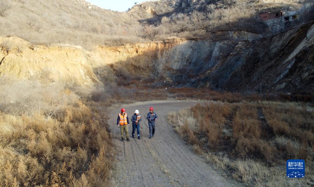 在天津市薊州區白澗鎮,谷叢楠(中)和團隊成員在實地踏勘(11月25日攝,無人機照片)。