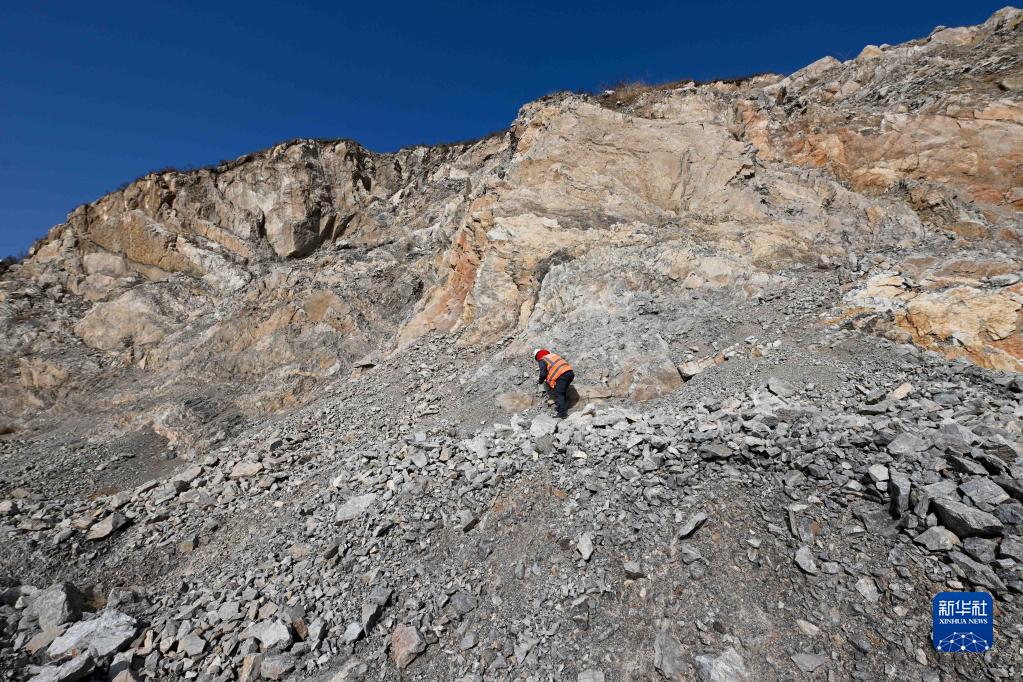 天津華北地質勘查局地災防治工作組成員在天津市薊州區一座廢棄礦山上測量坡面坡度(11月25日攝)。