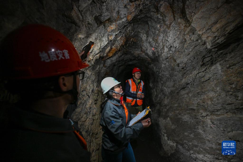 天津華北地質勘查局地災防治工作組成員在天津市薊州區一處廢棄礦洞里實地踏勘(11月25日攝)。