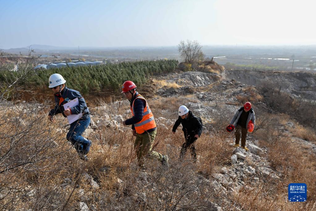 天津華北地質勘查局地災防治工作組成員在天津市薊州區一座廢棄礦山上實地踏勘(11月25日攝)。