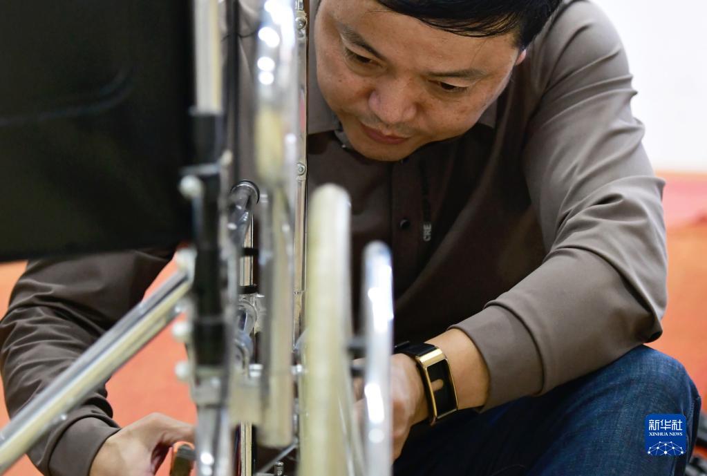 謝啟明幫一名輪椅使用者調試輪椅(11月25日攝)。新華社記者 魏培全 攝
