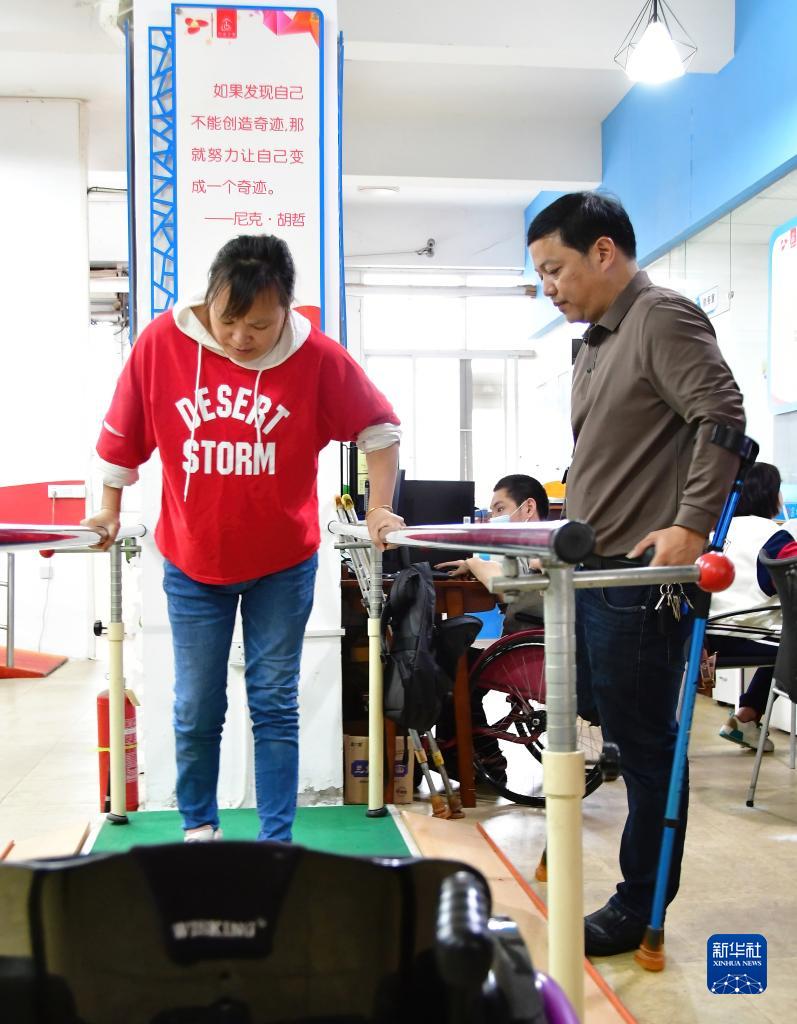 謝啟明(右一)在給一名殘疾人進行行走輔導(11月25日攝)。新華社記者 魏培全 攝
