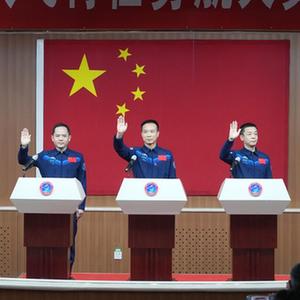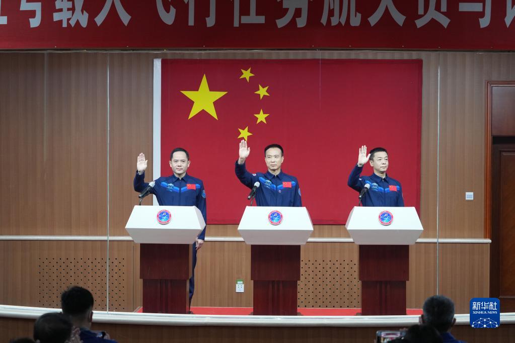 11月28日,執行神舟十五號載人飛行任務的航天員乘組費俊龍(中)、鄧清明(右)、張陸在酒泉衛星發射中心問天閣與中外媒體記者集體見面,并回答記者提問。