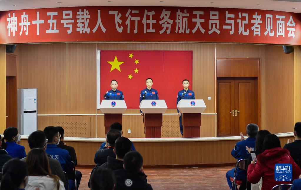 11月28日,執行神舟十五號載人飛行任務的航天員乘組費俊龍(中)、鄧清明(右)、張陸在酒泉衛星發射中心問天閣與中外媒體記者集體見面,并回答記者提問。