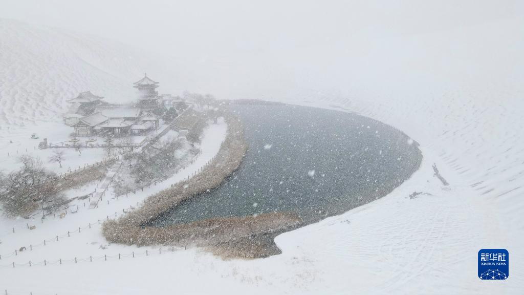 當日,甘肅敦煌迎來降雪。當地著名景點鳴沙山月牙泉銀裝素裹、分外迷人。