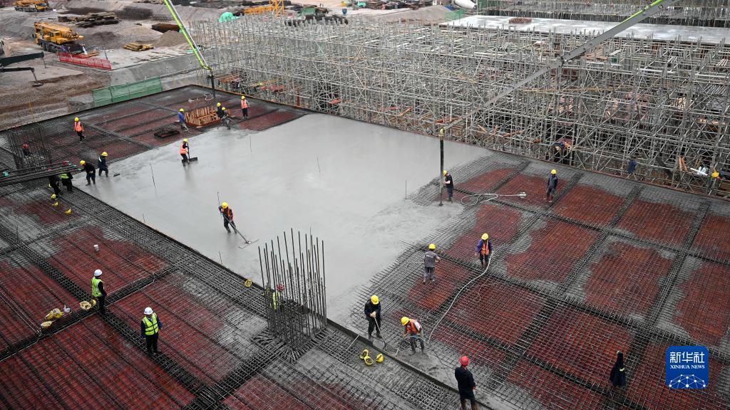 在玉林北站工地,工人在澆筑樓面混凝土(11月26日攝)。