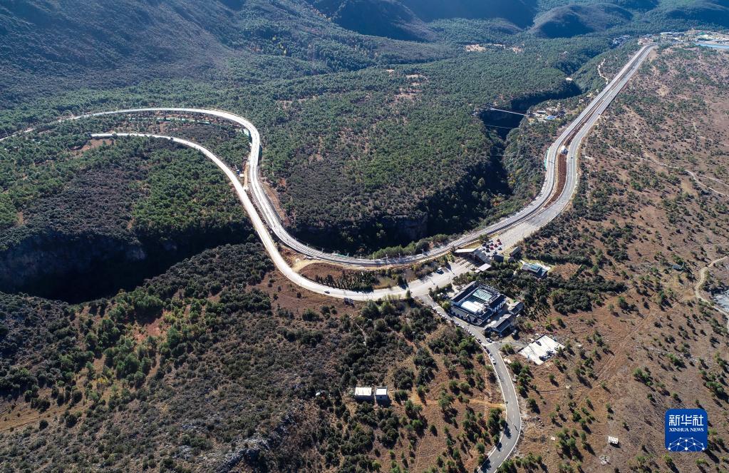 這是11月28日拍攝的麗江觀光火車一期工程玉龍雪山景區入口處的鐵路線,與旅游環線并行(無人機照片)。