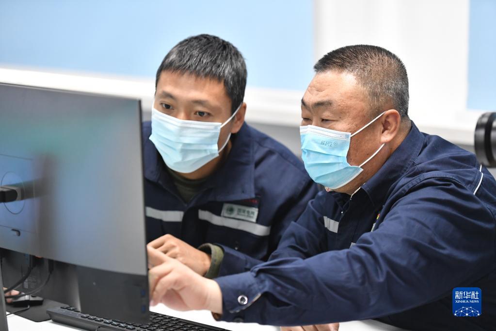 11月27日,于洋(右)與同事在智能巡檢中心用無人機采集的信息制作三維立體地形地貌圖像。