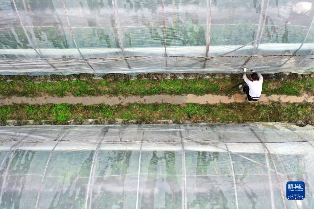 11月28日,農戶在浙江省樂清市石帆街道大林村西紅柿種植基地加固大棚,做好抵御寒潮的準備工作(無人機照片)。
