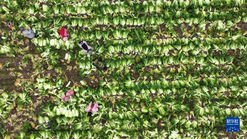11月28日,山東省臨沂市郯城縣馬頭鎮圩東村菜農在收獲大白菜,確保市場供應(無人機照片)。