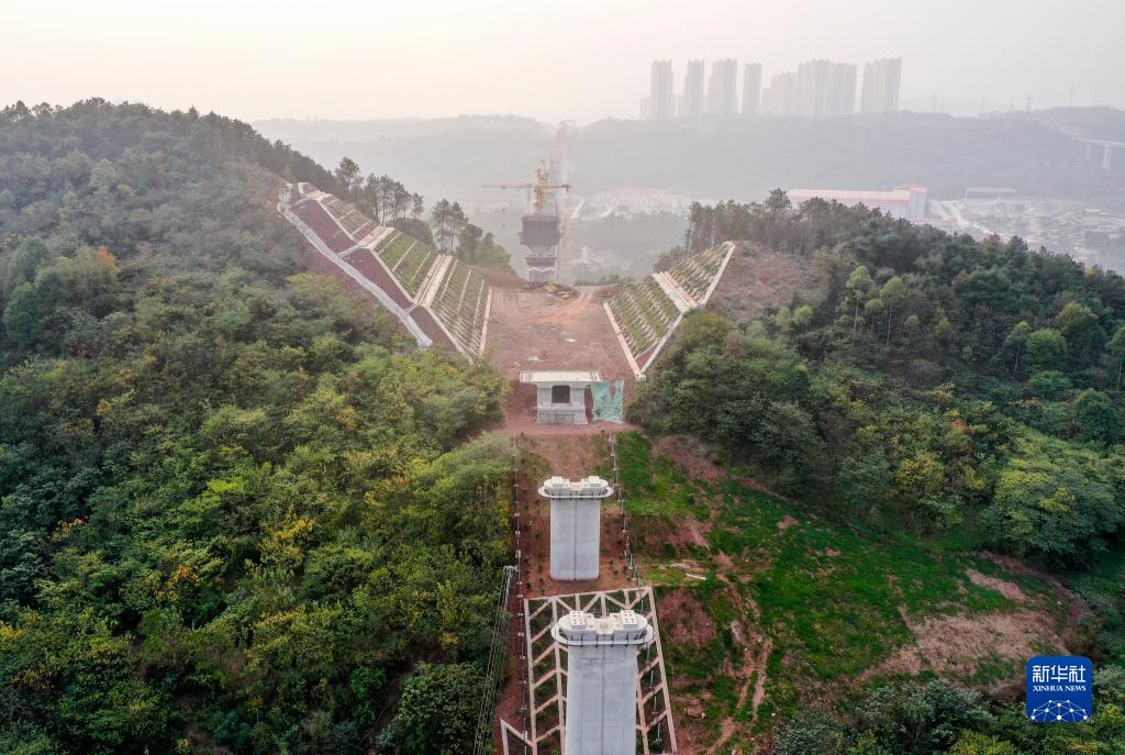 這是11月28日拍攝的建設中的渝昆高鐵川渝段華福大橋(無人機照片)。
