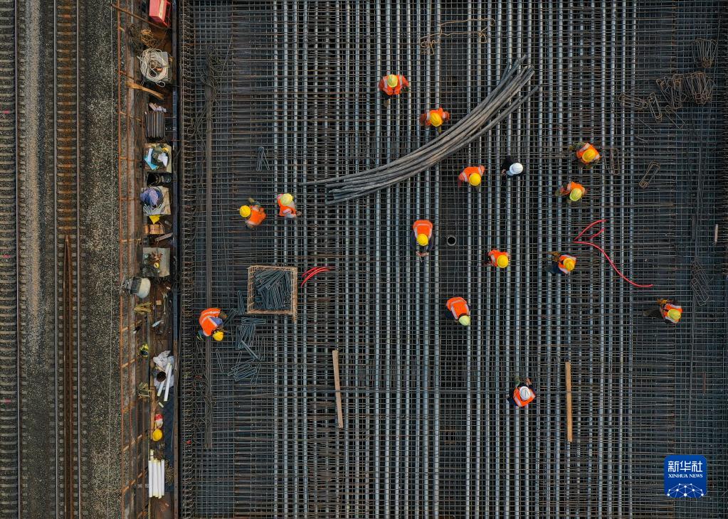 11月28日,工人在渝昆高鐵川渝段華福特大橋施工現場作業(無人機照片)。