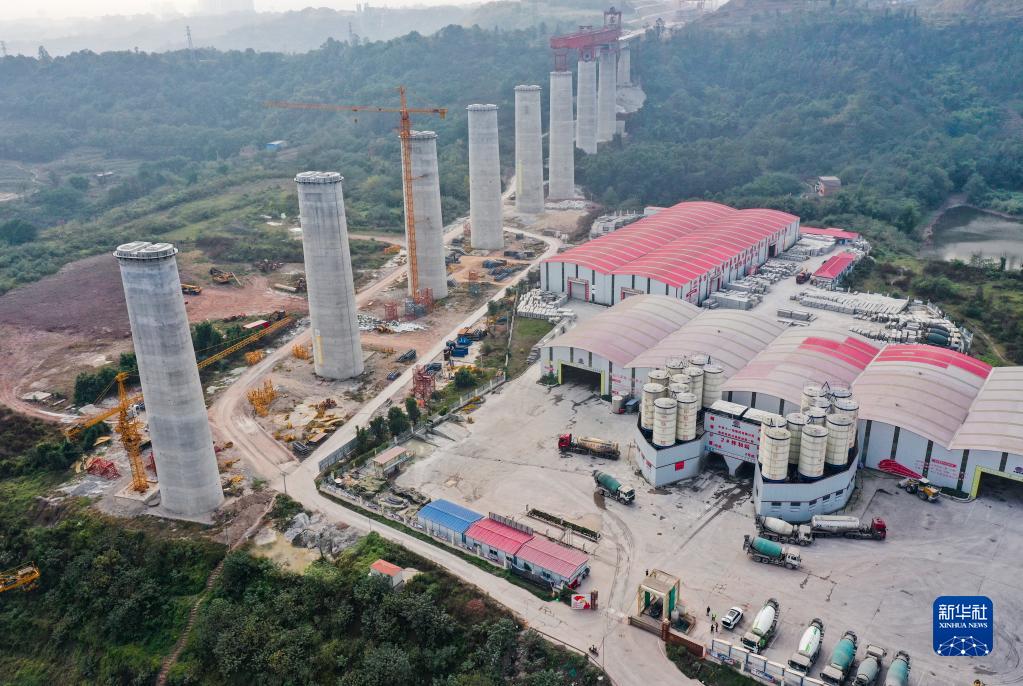 這是11月28日拍攝的渝昆高鐵川渝段站前一標2號拌和站及華福特大橋作業現場(無人機照片)。