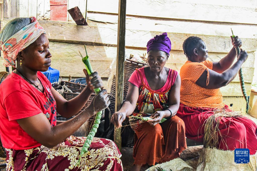 11月16日,在喀麥隆南部大區曼貢市一村莊,婦女用搗好的木薯面團制作木薯棒。