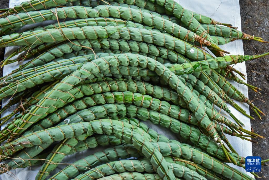 這是11月16日在喀麥隆南部大區曼貢市一村莊拍攝的捆扎好的木薯棒。