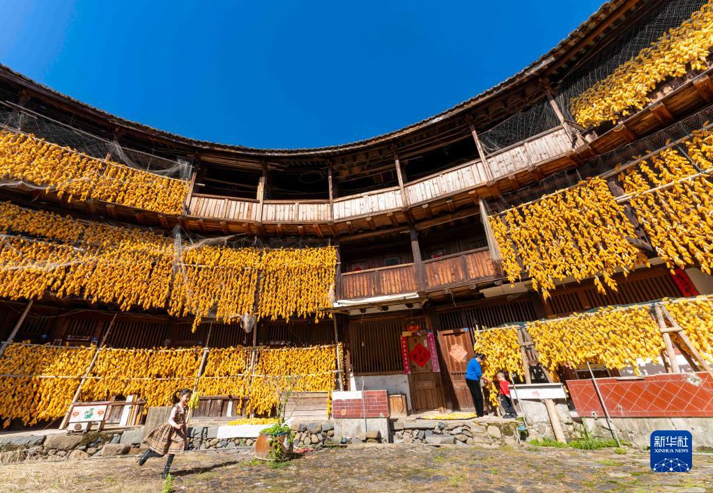11月29日在漳州市南靖縣梅林鎮梅林村拍攝的掛滿玉米的土樓。