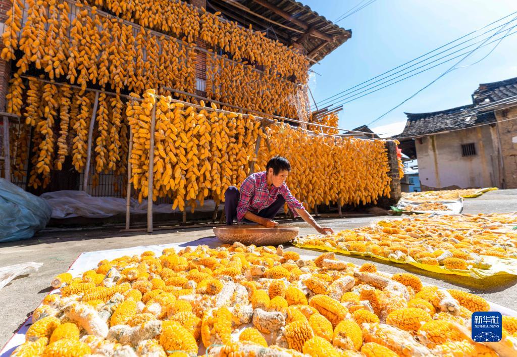 11月29日,漳州市南靖縣梅林鎮梅林村村民在自家小院里晾曬玉米。