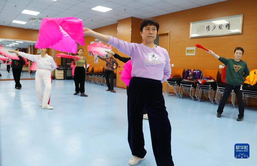 11月29日,健康聯盟興趣小組的居民在上海市虹口區市民驛站嘉興路街道第一分站跳扇子舞。
