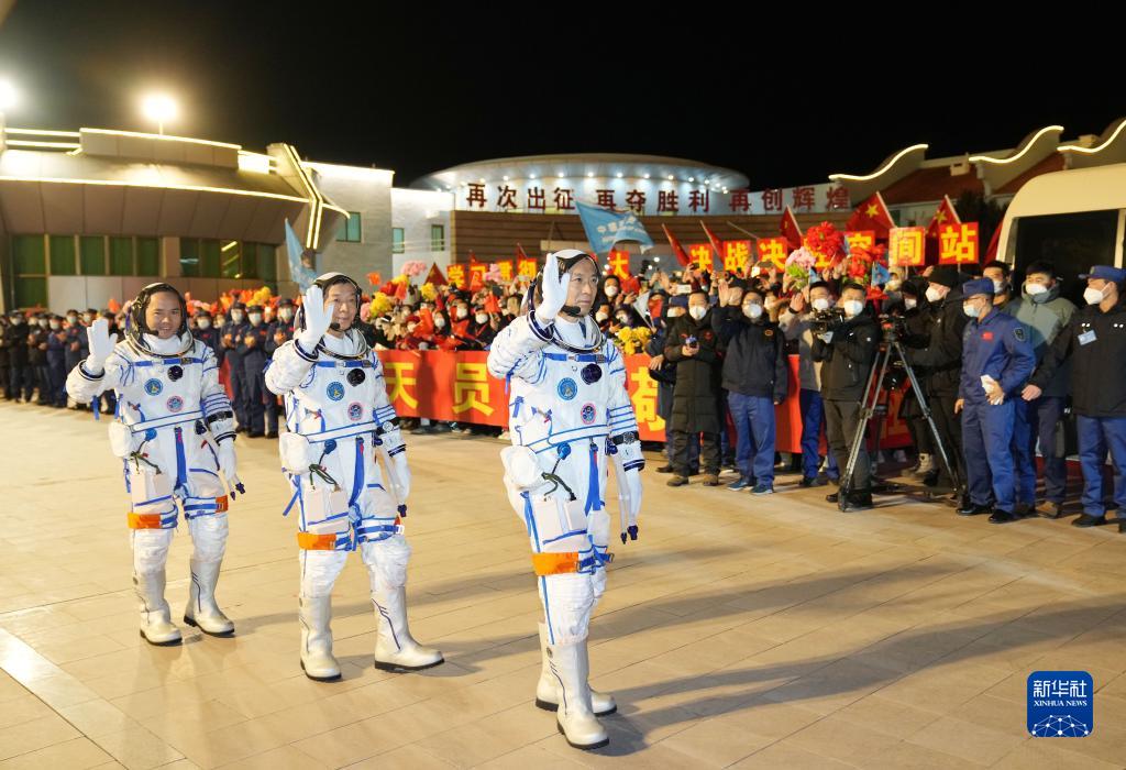 據中國載人航天工程辦公室消息,11月29日20時18分,神舟十五號載人飛行任務航天員乘組出征儀式在酒泉衛星發射中心問天閣圓夢園廣場舉行。航天員費俊龍(前)、鄧清明(中)、張陸在出征儀式上。