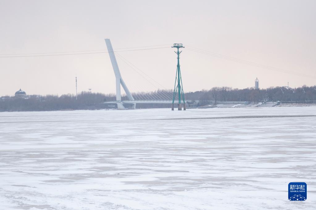這是11月29日拍攝的哈爾濱松花江鐵路大橋附近已封凍的松花江江面。
