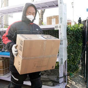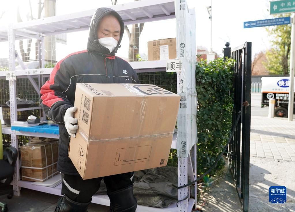 11月29日,在北京市海淀區中關村街道一處快遞點,快遞員在寒風中搬運快遞。