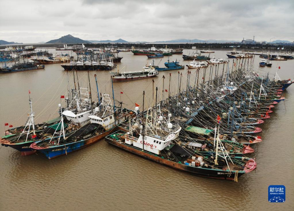 11月29日,在浙江省臺州市路橋區金清鎮漁港,漁船進港避風(無人機照片)。